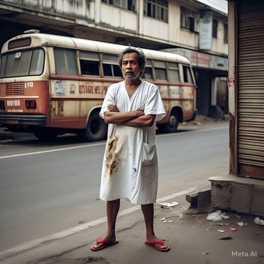 There was no shade to be found so I stood on the roadside of the building in hopes of catching a passing breeze created by the fast-moving cars, taxis, and busses flying by. The food court around the corner was lined with vendors of all types however the last thing on my mind was eating. It was way too hot. But someone seemed happy and in a good mood. I heard singing and it was just around the corner from where I was patiently standing. A moment later a young man dressed only in what appeared to be a flowing white hospital gown and wearing red flip flops appeared and without missing a beat of his song he walked by me. I whispered thank you God, he didn’t stop. And then the singing stopped. Afraid to look up I closed my eyes and then felt a tap on my shoulder. I could feel his breath on my damp skin. I opened my eyes halfway and tried to read his name on the hospital band that seemed to float on his skinny arm. I looked up and he was now standing by my side and without saying a word he pressed his long thin fingers deep into my shoulder.