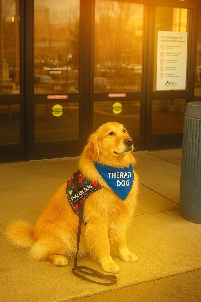 Quinn, a golden retriever whose coat shimmered like fields of grain kissed by the afternoon sun stepped into the hospital lobby with soft paws and solemn purpose. Around his neck fluttered a blue bandanna, bold and gentle, embroidered with the words Therapy Dog. His harness, snug and bright, was a canvas of red, blue, and yellow hearts each heart a promise, a touchpoint of silent comfort. On either side, the words Therapy Dog gleamed like a quiet declaration: I am here to love. I am here to listen.