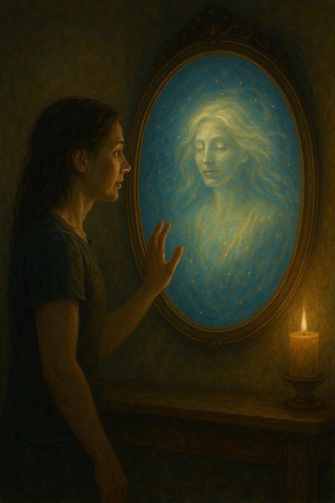 And saw two reflections. The first was her earthly self pale, recovering, and still carrying the shadow of something vast and sacred.