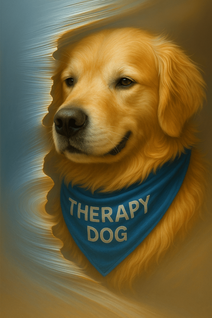 In the quiet corridors of a local Community Hospital, a golden retriever therapy dog, moved softly over the worn linoleum floors. His fur was a warm cascade of sun-kissed gold, and his eyes held a gentle wisdom that seemed to reach beyond the physical world. Quinn was gifted with an innate ability to sense pain, loneliness, and fear in those he encountered. Once or twice a week, Quinn made his rounds, tail wagging, bringing comfort to patients and staff alike. His presence was like a soothing balm, easing the burdens of illness, fear, and uncertainty. On one visit, as he trotted down the hallway, he sensed something different, a heaviness that hung in the air like a storm cloud. The hospice wing was his final stop. The rooms here were dimly lit, and the air smelled of antiseptic and fading memories. Without human direction Quinn’s paws carried him to Room 1217, where the door stood ajar. Inside, a frail figure lay on the bed, by his side, two devoted friends. The patient had no family left. His life had dwindled to this small room, and the end was near. The patient appeared unconscious, his eyes open and staring as if awaiting the arrival of past friends and family members that passed before him. His breathing shallow and his dry, cracked lips parted. The tubes that once snaked from his arms, and the heart monitor had been removed. That part of his long fought journey was over. His friends, sat vigil, their eyes red-rimmed from tears. They whispered stories of their dying friends adventurous life, of laughter shared and dreams pursued.