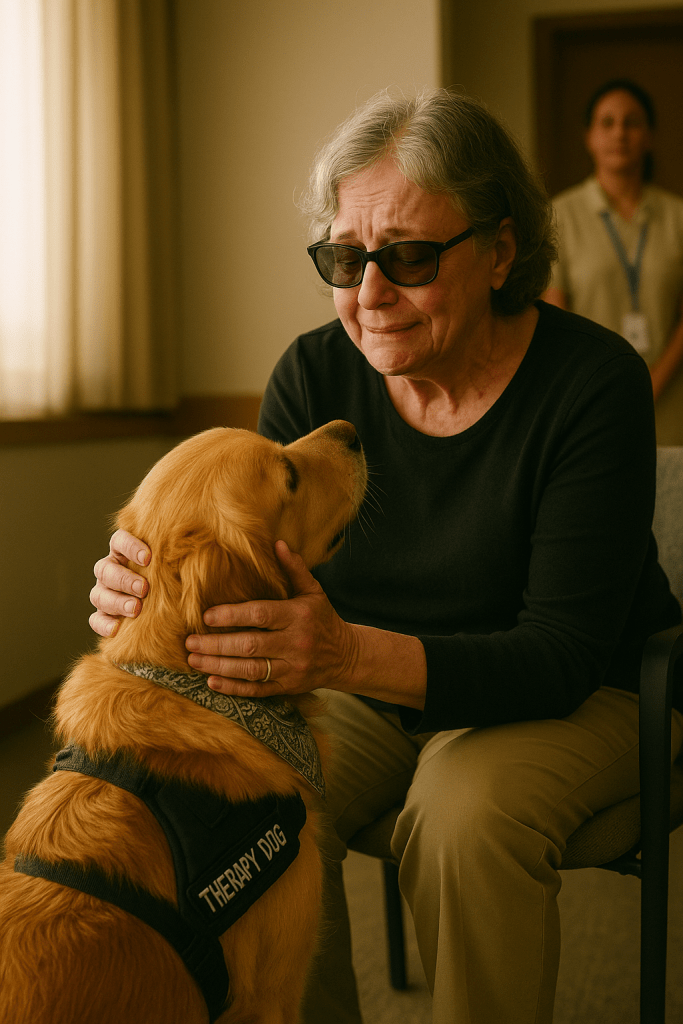 The meeting took place in a quiet community conference hall. The hum of fluorescent lights was softened by the muffled sounds of hospital life seeping in from the hallway, rolling wheels, faint chatter, distant overhead pages. But here, within these walls, a stillness took hold. The aide helped the patient settle into the chair beside me, and I gave a slight nod to Quinn. Without hesitation, Quinn moved in front of her and sat tall but calm, like a sentinel wrapped in golden fur.