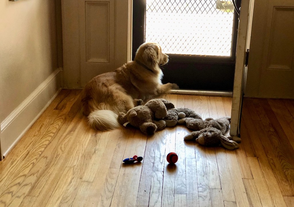 I never noticed it until after Abby was gone. That fall morning, sunlight spilled across the hardwood floor, pooling at the spot by the front door where she always waited. The glass in the storm door caught the light, turning it into a warm halo around her golden fur. Abby lay there with her chin lifted toward the world outside, one paw resting gently against the doorframe, as if she was holding the day in place just for me.