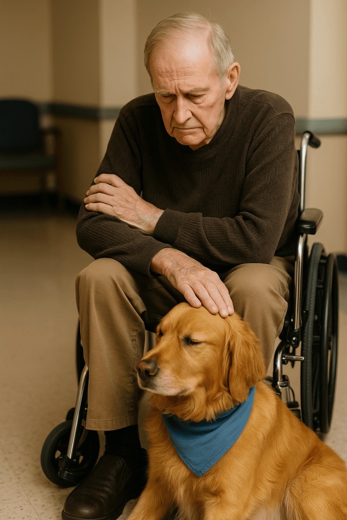 Quinn didn’t know that. My golden boy sees none of the label’s we humans place on each other. He only knew that there was a soul sitting by himself. His paws tapped gently against the polished floor as he made his way across the room, his blue bandanna swinging slightly with each step. His tail wagged not wildly, but slow and steady, like the rhythm of a heartbeat. When he reached the man’s corner, Quinn didn’t leap forward. Instead, he lowered himself to the ground, front legs stretched out, chin resting on his paws. His whole body said, “I’ll wait. I’ll be here, when you’re ready.”