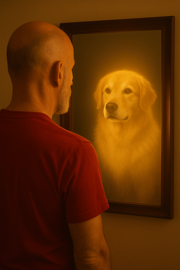 When sorrow sinks me like a stone in deep water, he rests his luminous head on my lap. The glow of his spirit soaks through my skin, warming me from the inside out. Tears fall, but he never moves. He stays until the river of grief slows and I can breathe again.