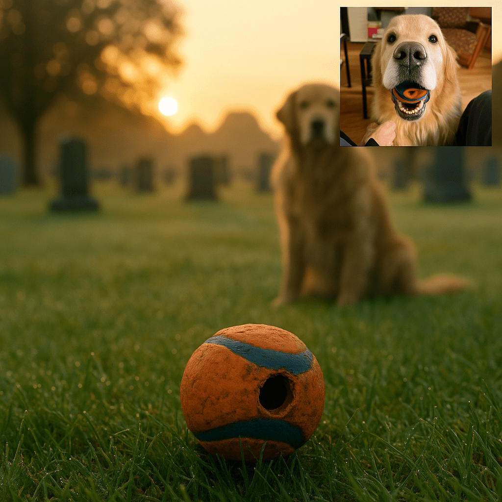 There, sitting in the damp morning grass, was Abby’s ball. Red and orange.Weathered from years of play. With the same quarter-size hole in it. The same scuff marks.